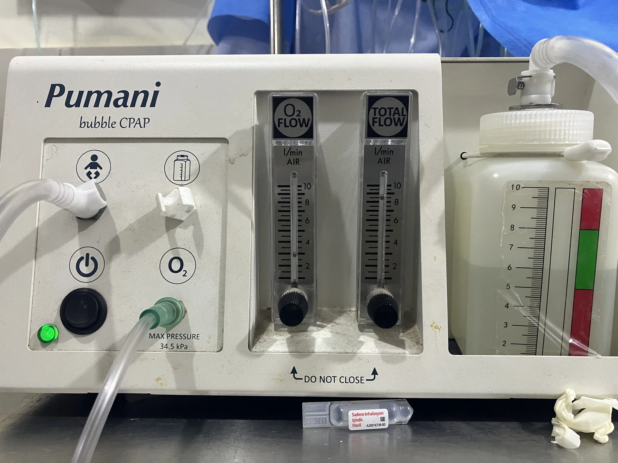The first obstacle was to provide enough equipment to support routine use of CPAP. And, not just general equipment – the same CPAP equipment that already existed at JFK, so folks can be trained on using one interface, rather than have to memorize how multiple different devices work. There is a pediatric CPAP device designed for use in low resource settings called the Pumani (Figure 1). It is small, durable, has very few components, easy to repair, and is relatively inexpensive (a little over $1000). The Boston team had previously purchased one for the JFK Pediatric Emergency Room, where we planned to launch IMPeL (excellent, we don’t have to introduce something new!). We procured five more Pumanis and a couple of years’ worth of associated disposables and shipped those to Liberia.